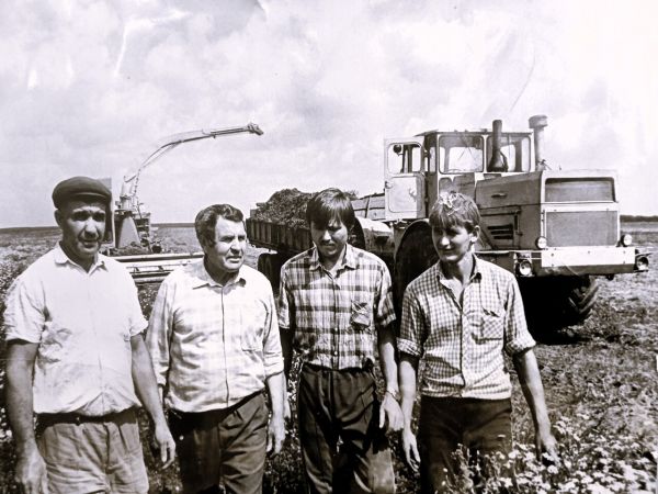 Председатель колхоза «Россия» Ларионов Иван Фёдорович (второй слева) с механизаторами. 1985 год. Архив Ковалинской сельской библиотеки