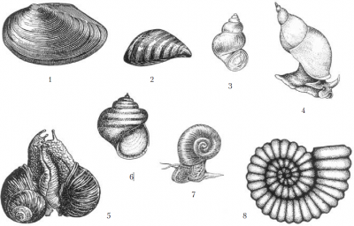 Моллюски: 1. Беззубка (Anodonta); 2. Дрейссена изменчивая (Dreissena polymorpha); 3. Битиния (Bithynia leachi); 4. Прудовик обыкновенный (Lymnaea stagnalis); 5. Виноградные улитки (Helix pomatia); 6. Лужанка (Viviparus conteclus); 7. Роговидная катушка (Planorbarius comeus); 8. Ископаемый аммонит Douvilleieeras