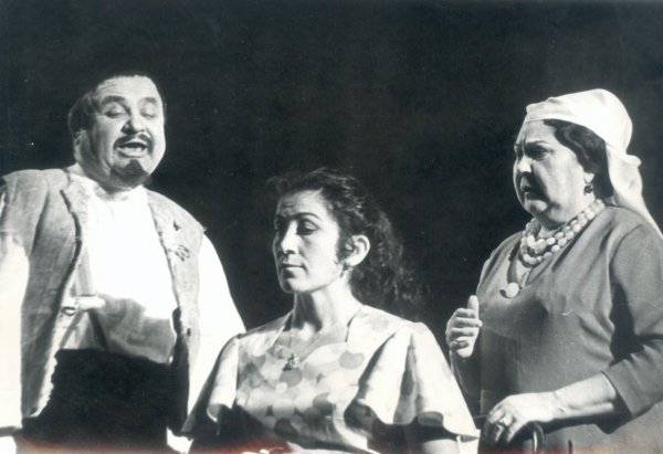 М.Г.Миңлебаева Миңкамал ролендә («Чикләвек төше», Г.Ахунов; сулда – Гыйбадулла ролендә Г.Шамуков һәм Рокыя ролендә Н.Ихсанова)